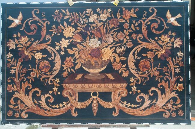 Table en marqueterie de bois d’époque Napoléon III Une œuvre d’art décoratif du XIXᵉ siècle Cette table Napoléon III incarne l’élégance et le raffinement du Second Empire. Elle associe virtuosité technique et richesse ornementale, caractéristiques de la marqueterie française du XIXᵉ siècle. Le plateau, au fond en poirier noirci, présente une composition centrale remarquable :…